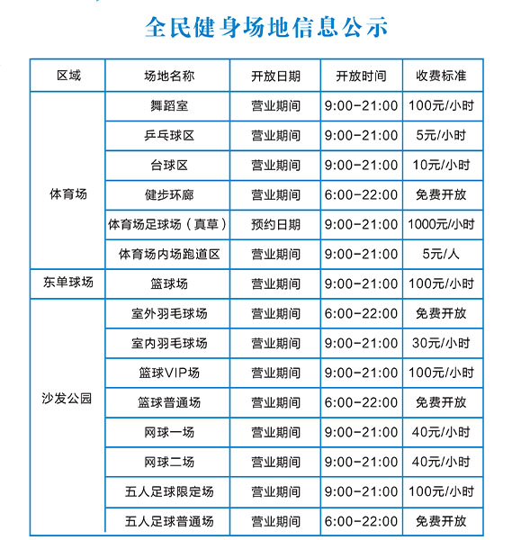 低收费场地包括VIP篮球场、VIP网球场、VIP羽毛球场和VIP五人制足球场、体育场田径跑道、体育场内的乒乓球区、体育舞蹈室等,低收费场地均低于市场同等场地价格,hth·华体会体育并推行会员消费制进一步打折优惠。 8月8日全民健身日期间所有场地均免费对群众开放。